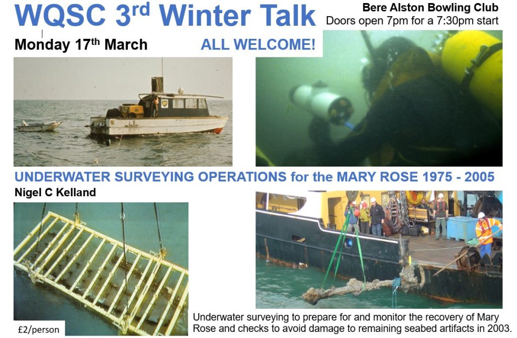 17th March – 3rd WINTER TALKUnderwater Surveying Operations for the Mary Rose by Nigel Kelland at Bere Alston Bowling Club, doors open at 7:00pm for a 7:30pm start and open to all.